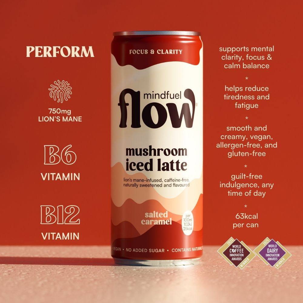 A salted caramel oat latte with 750mg Lion's Mane fruiting body extract and B vitamins. Made with British oat milk. Naturally sweetened. Nothing artificial, nothing you don't need.